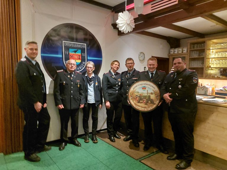 Er unterbrach seinen Tätigkeitbericht um Familie Wulf vom Ortskommando mit einer kleinen Aufmerksamkeit zu überraschen. Diese stellt zu jedem Erntefest Hof und Halle zur Verfügung, damit die Erntewagen der Ortsfeuerwehr dort liebevoll geschmückt werden können. Als Dank dafür überreicht er ein Schild in Namen aller Abteilungen.